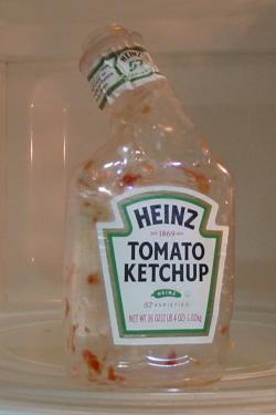The last bit of ketchup comes out of the bottle easily if you heat it in the microwave. If the ketchup is in a plastic bottle, you also get a nifty bit of sculpture.